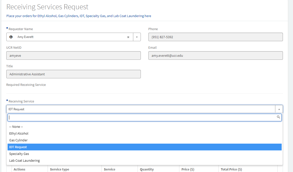 Receiving Services Request Screenshot